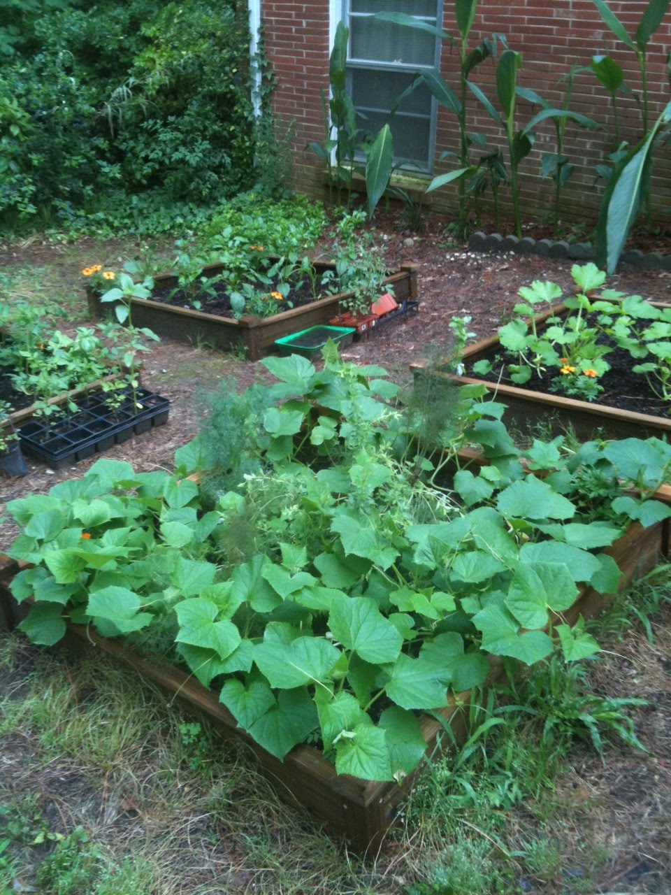 The heat and humidy has helped everything to grow fast but also brings mildew. Companion plantings of marigolds and basil help to reduce the threat of insects. The hot nights slow the blooming cycles of the peppers and tomatoes but once the nights cool they will begin blooming again!