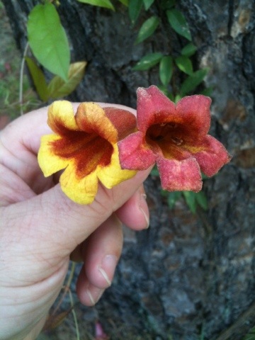 One of my favorite native vines is blooming. Cross Vine (Bignonia capreolata) is an evergreen vine that can grow to the top of a pine fast and are covered in short trumpet blooms in the Spring and sometimes throughout the Summer.