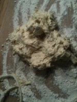 Dump out onto a well-floured board and knead lightly about six times. Roll the dough out to a rectangle about 10 by 5 inches.