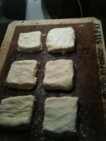 With a sharp knife that has been floured, cut the dough lengthwise in half then across in quarters, making roughly 8 rectangles.