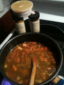 4) The onions should be soft now so you can at the vegetables. I cheated and used two cans of mixed vegetables in addition to a tablespoon each of cumin, turmeric, and curry powder. Cook for about 10 or 15 minutes and then turn the heat off.