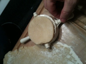 7) Use the back of the dumpling maker to cut the dough out.