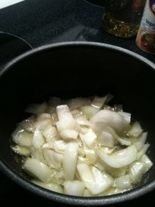 1) I started off heating olive oil on medium heat. Once is shimmers, I add half of an onion that was in the refrigerator. Add salt and pepper to season.
