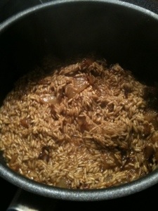 2) After the onions have softened, add the rice and stir until the oil is absorbed. About 5 minutes.