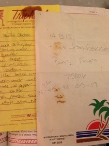 The most treasured items to me are the hand written notes, photographs, or inserted recipes I often find. The one below looks like an address in Paris followed by a series of numbers. A Paris phone number? A woman’s measurements? It was found in a cookbook afterall!