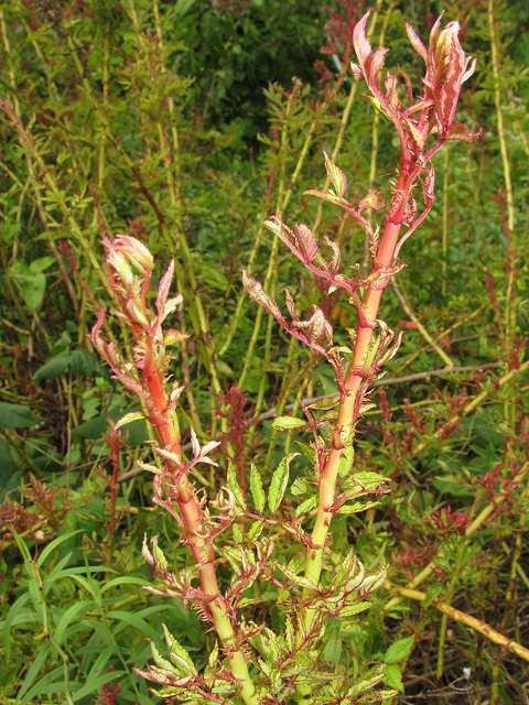 Rose Rosette Virus: Rose rosette disease is a viral rose disease spread by a tiny insect. The virus is specific to roses with Rosa multiflora being its primary host. The disease is sometimes called witches’ broom because of the way it causes new shoots to grow straight up and close together in broom-shaped clusters. There is no cure. Once a plant is infected it should be burned to destroy the virus and the plant.