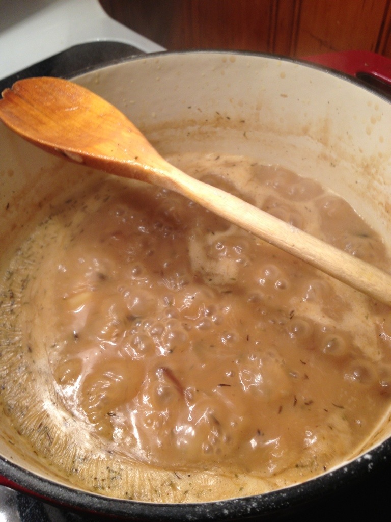 2) Once the onions are soft and are beginning to caramelize add about 4 cups of broth and bring to a boil. Added three tablespoons of flour. Stir vigorously to incorporate. Add a few potatoes that have been peeled and cut into about one inch chunks. I added a tablespoon of Balsamic vinegar. The potatoes should be soft and cooked in about 15 to 20 minutes.