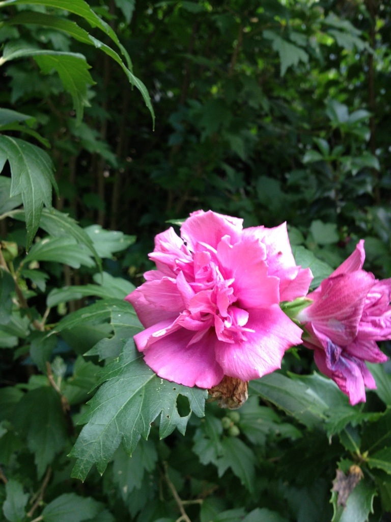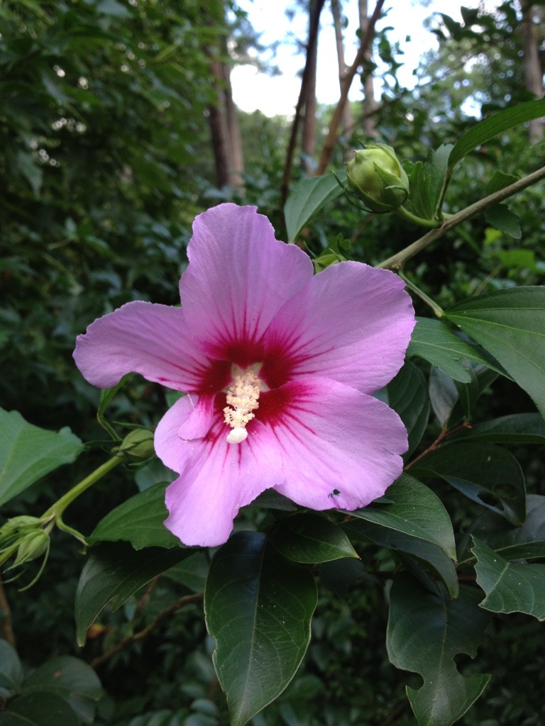 The Rose-of-Sharons (Althea) are blooming now, too. They are a wonderful late Summer and Fall bloomer and the single flowered cultivars reseed heavily so there are always volunteers.