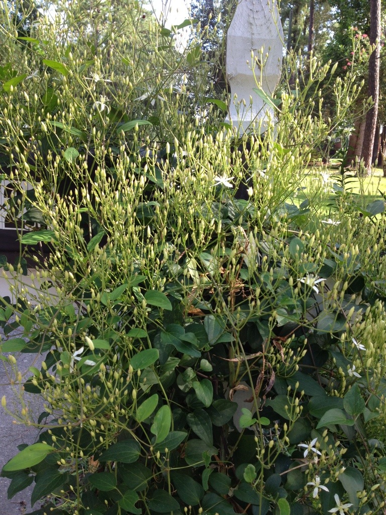 The Fall blooming Autumn clematis are budding and beginning to open. It’s a wonderful Fall-blooming evergreen clematis. The blooms are small but fragrant and they bloom heavily. The vines are so vigorous that I cut them back to just a few feet or so in early Spring. They grow back into large tangled masses by the Fall blooming season. They produce fluffy masses of seeds after blooming and reseed all over the yard. I have them on the mailbox and on the lamp posts.