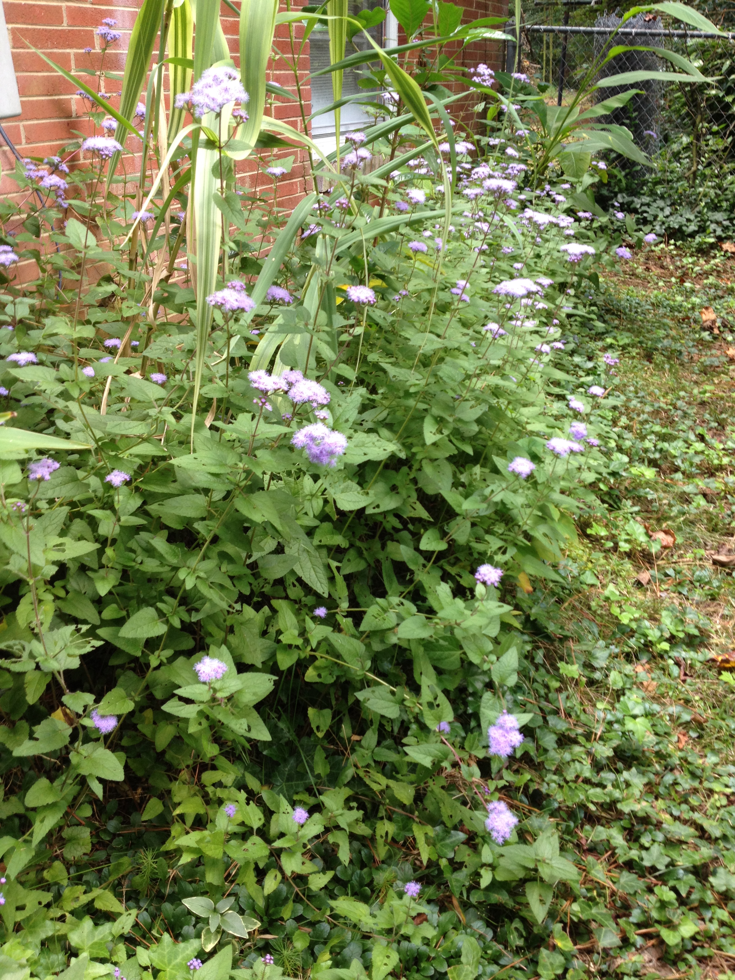 Blue Mist Flower (Eupatorium coelestinum) forms large colonies and usually requires moist soil but on the South side of the house they are in direct sun all Summer and they never receive supplemental water because the hoses are difficult to drag over there. Still they form a thick colony about two feet tall along the entire foundation.