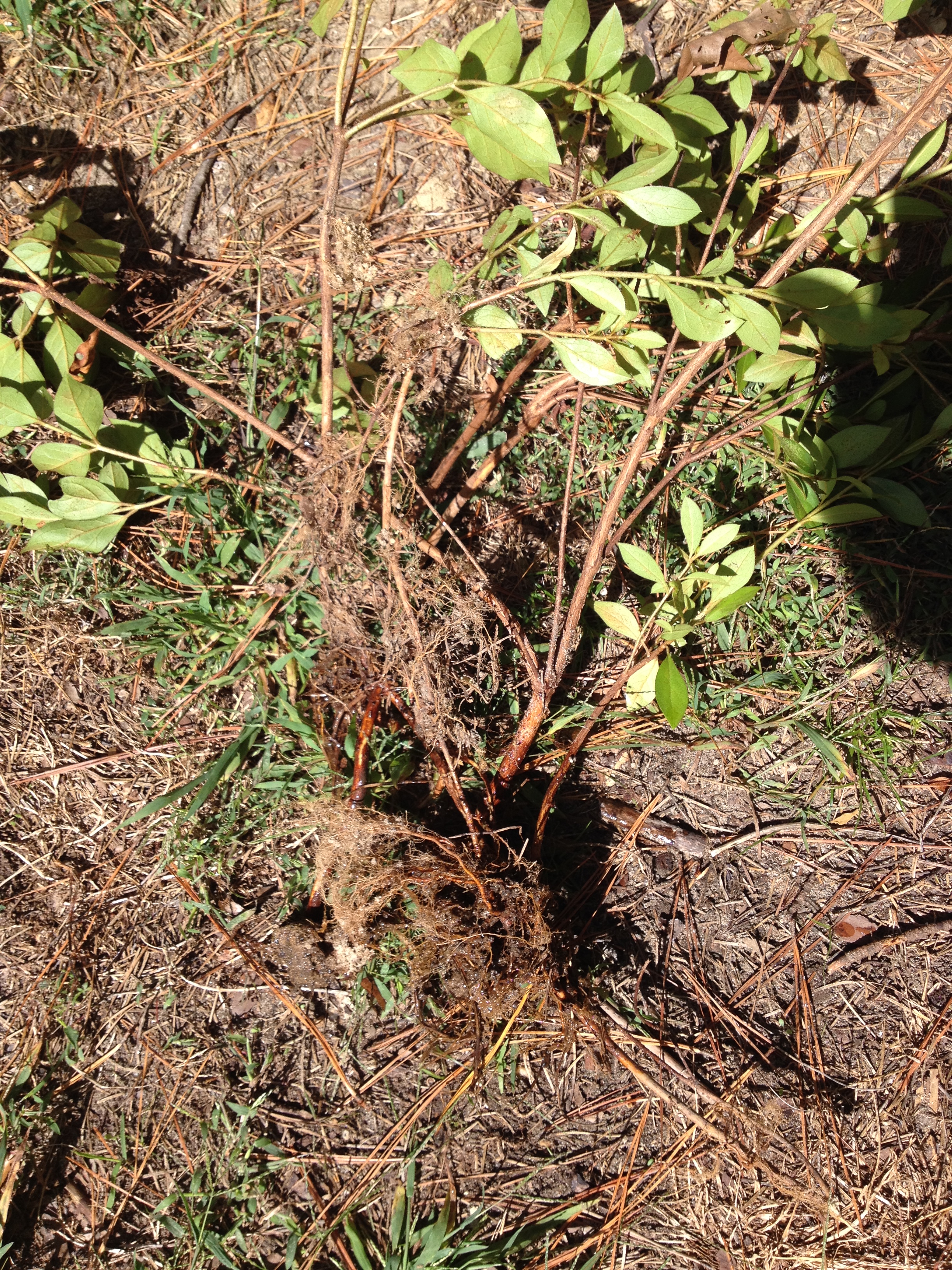 Every year I rake the fallen oak leaves back around the oak and the azaleas. This buries some of lower limbs under the leaves. They eventually root and form new plants. I separated these from the mother plants and will use them to fill empty pockets in this bed and maybe plant a few around the yard. This is my favorite Indica type azalea. They grow very large, 8 to 10 feet, and have large purple or magenta flowers. They are cold sensitive and will not grow much father North.