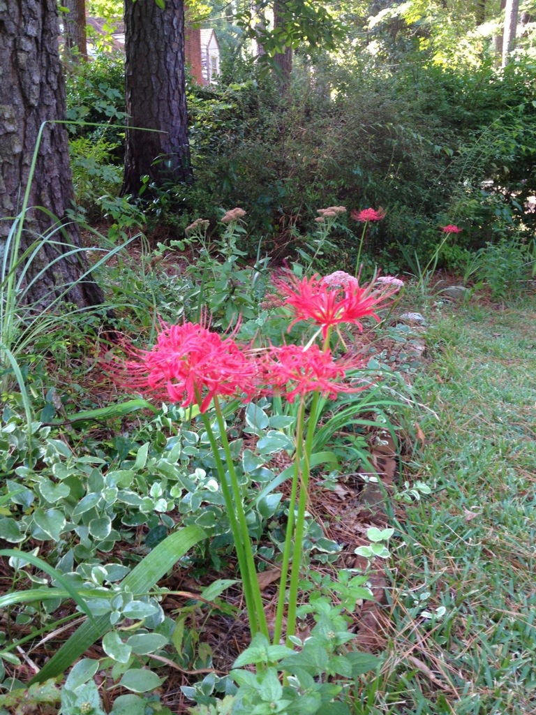 The hurricane lilies (lycoris) continue to bloom. After they bloom the foliage grows and persist through out the winter then dies in the spring.