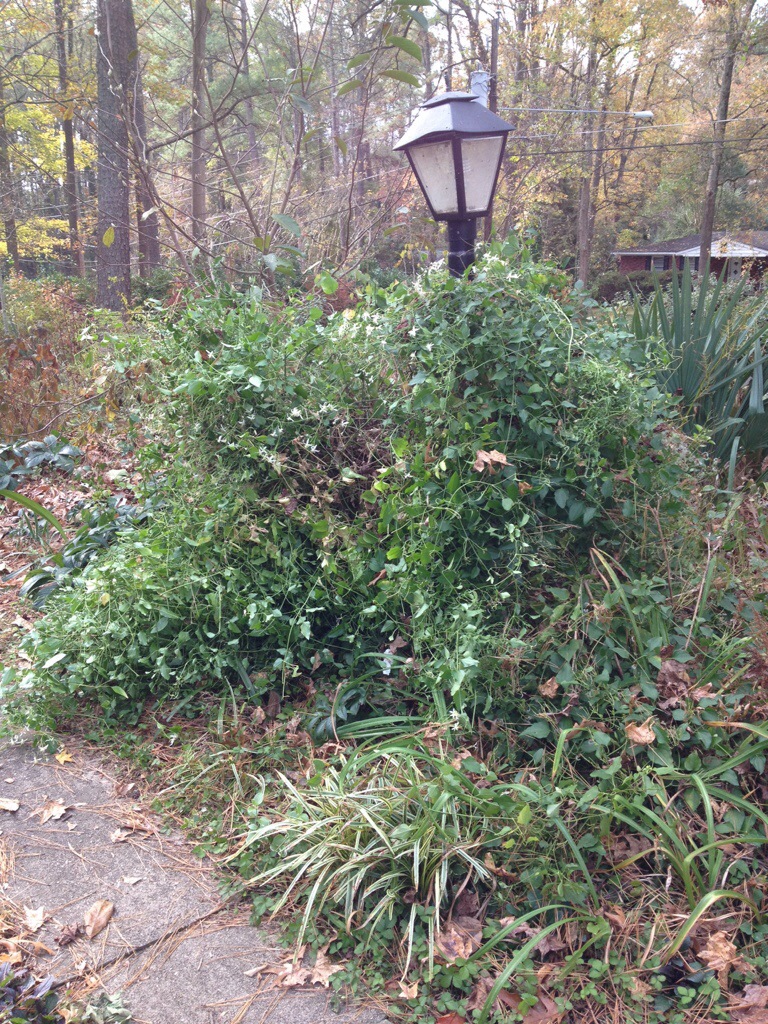 I have several around the garden thanks to the habit of reseeding. They have an unusual growth habit in that they grow throughout the Winter and by Spring can nearly cover structures such as the lamp-post. The one below I have posted several pictures in bloom before. They begin blooming in late August with very sweet-scented small white flowers.