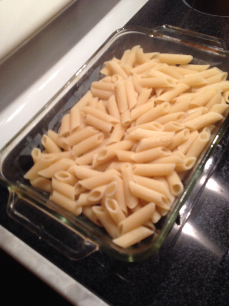 6) when the cheese has been incorporated, lightly butter a 2 quart casserole dish and pour in the drained pasta.