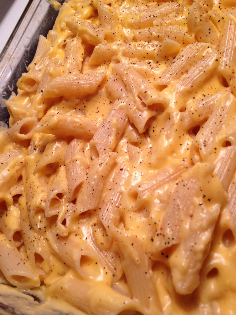 7) pour the cheese sauce over the pasta evenly and mix it in. I sprinkled fresh pepper on top.