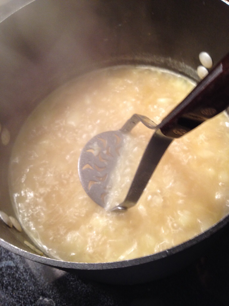 2) Stir in the potatoes, chicken broth, milk, and salt and pepper. Cover, reduce heat and simmer until the potatoes are tender, about 15 minutes. Once they have softened I used a potato masher to mash-up most of the fennel and potato. The recipe calls to blend it but I don’t have an immersion blender and its messy to use a counter top blender. Plus, I like the rustic look and taste of having some large pieces of potato and fennel bulb in the soup.