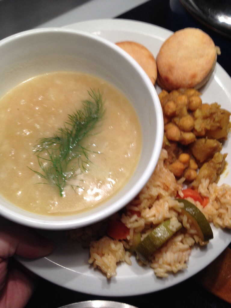 The fennel added a sweetness to the usual potato soup flavor. I served the soup with sides of curried chickpeas and potatoes, and rice with zucchini and carrots.