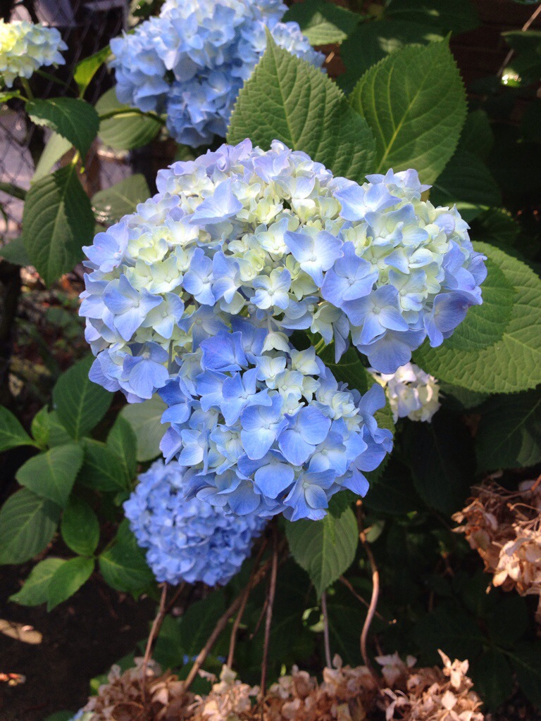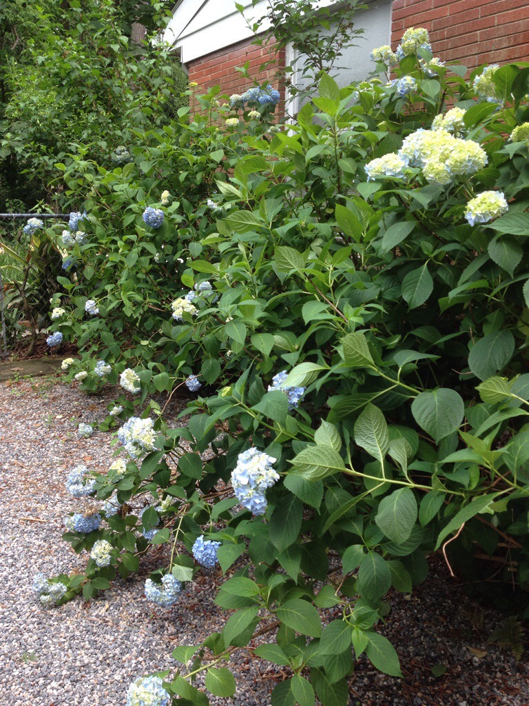 The hedge along the North side of the house is between the parking area and the chimney in part-shade. The red brick makes the perfect backdrop! Since we have acid soil here the flowers are blue. If the soil was alkaline they would pink. Neutral soil would produce a blend of pink and blue which looks purplish!