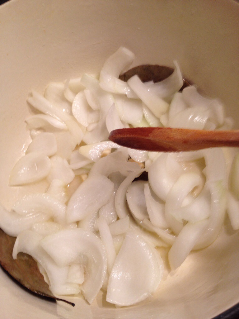 1) Coat the bottom of a Dutch Oven with olive oil and add a few tablespoons of butter and heat over medium. Once the butter has melted add the garlic.