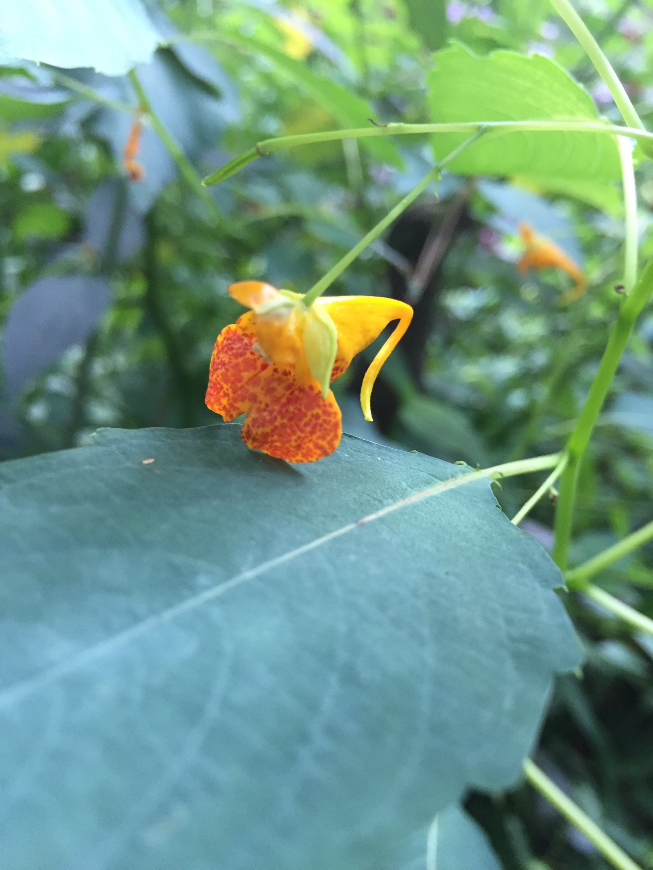 A new plant for me this year is Jewel Weed. It’s a native impatient which grows in moist lowlands such as along streams. I placed it behind my small lily pond where it would receive plenty of splashed water from the pond.