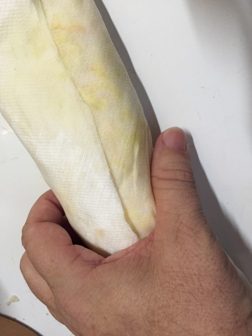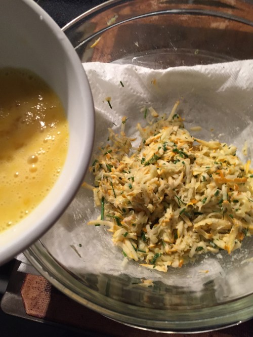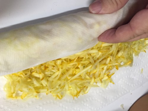 2) Place a paper towel on top of the graded zucchini and roll it tightly and applying pressure to squeeze out the moisture. Place a heavy plate or pot on top to help squeeze out as much moisture as possible.
