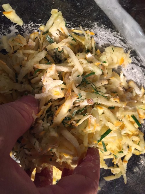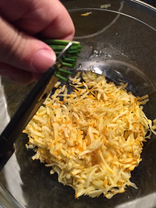 4) Place the drained zucchini in a mixing bowl and snip in several tablespoons of chives or scallions.