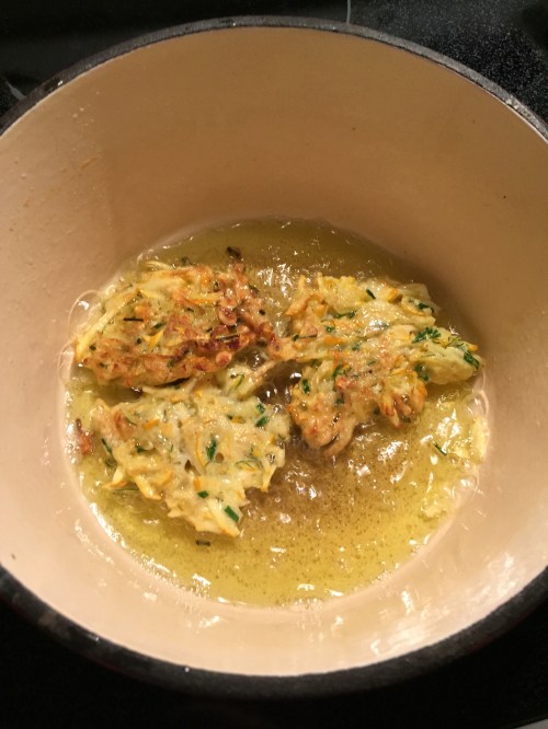 10) Cook 2 to 3 minutes on each side until the fritter is cooked through. The time it takes for the fritter to cook through to the center will depend on the thickness.