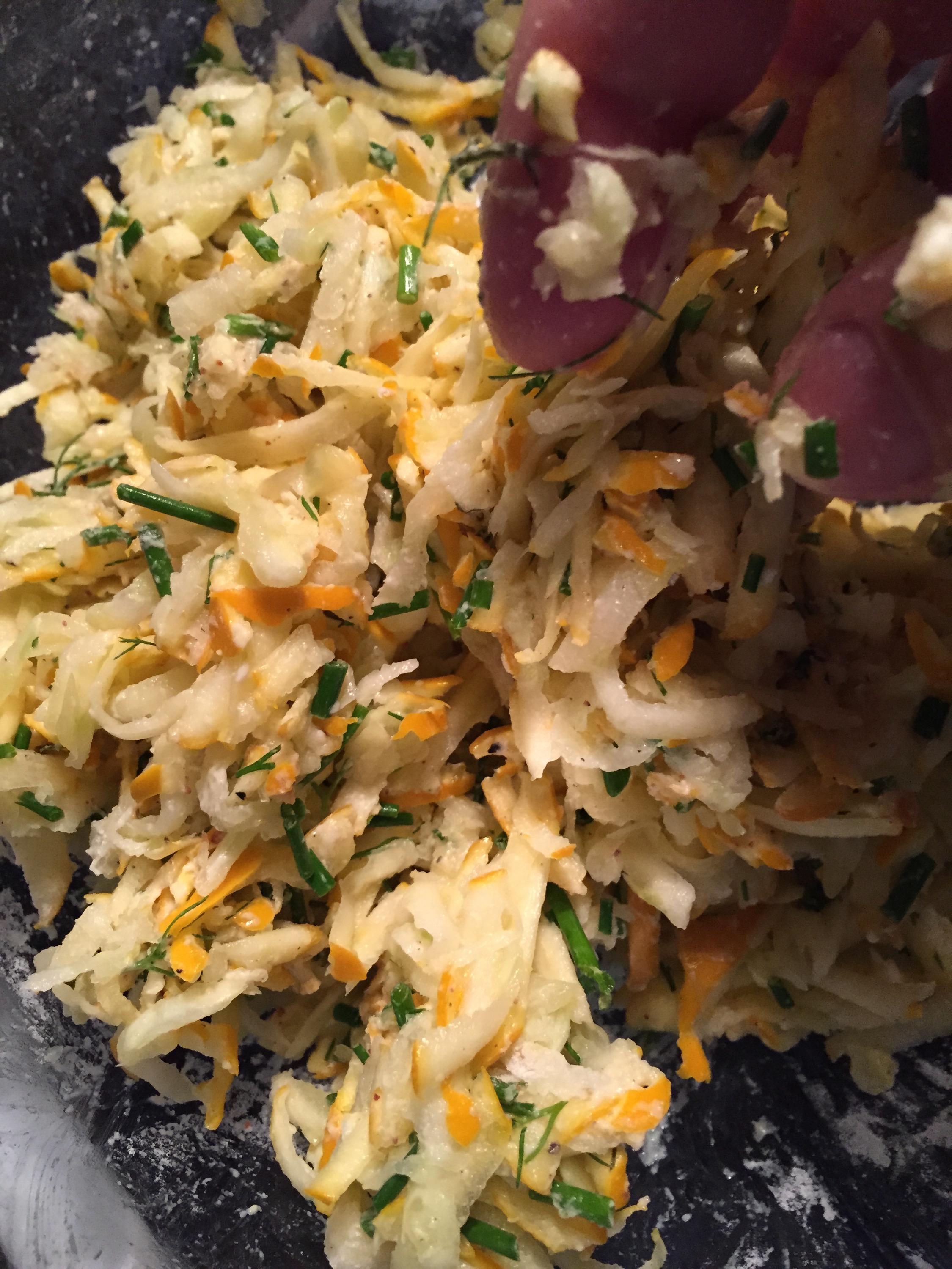 4) Place the drained zucchini in a mixing bowl and snip in several tablespoons of chives or scallions.