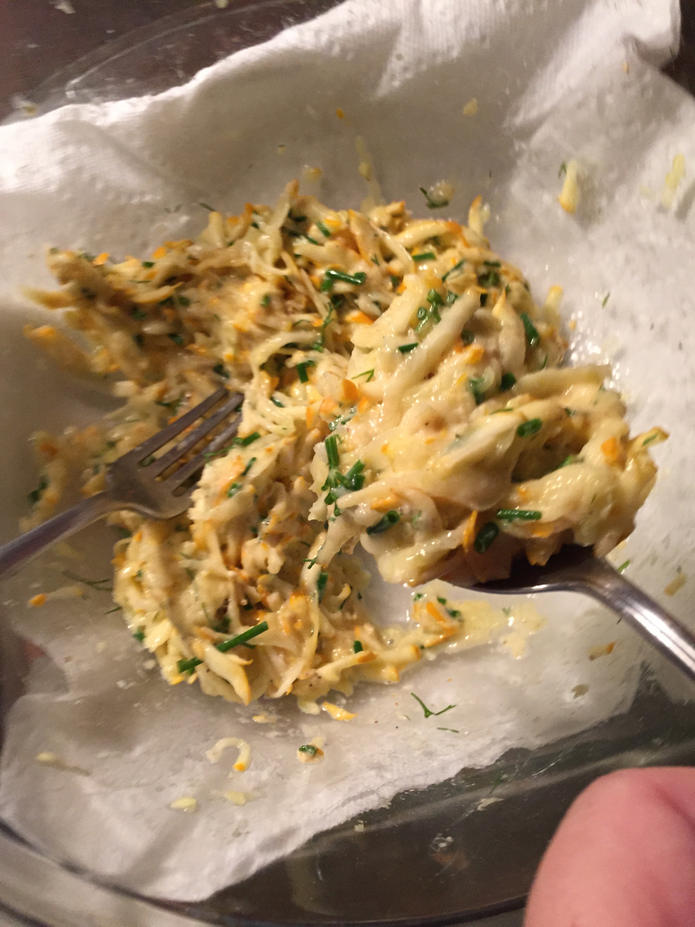2) Place a paper towel on top of the graded zucchini and roll it tightly and applying pressure to squeeze out the moisture. Place a heavy plate or pot on top to help squeeze out as much moisture as possible.
