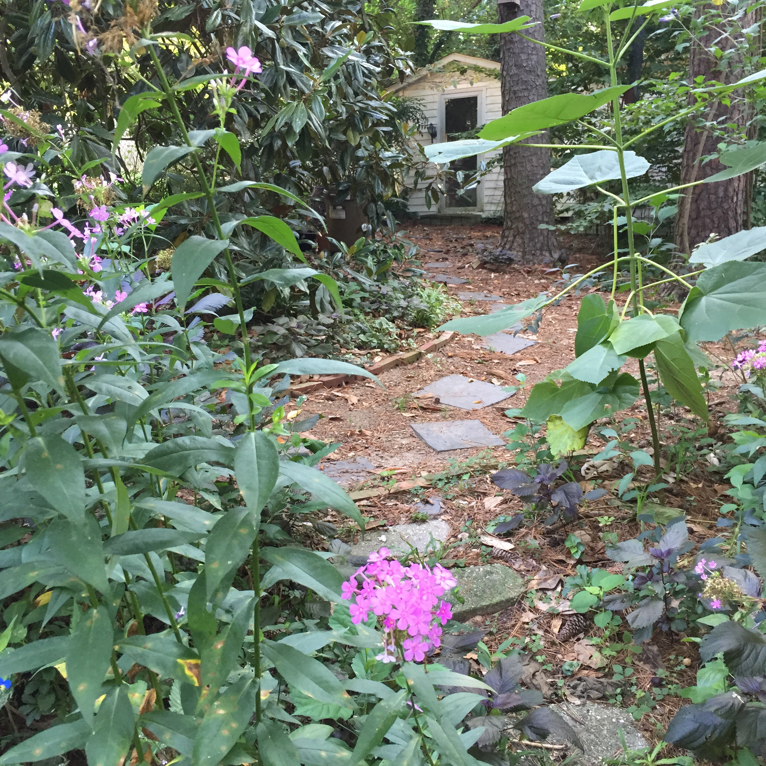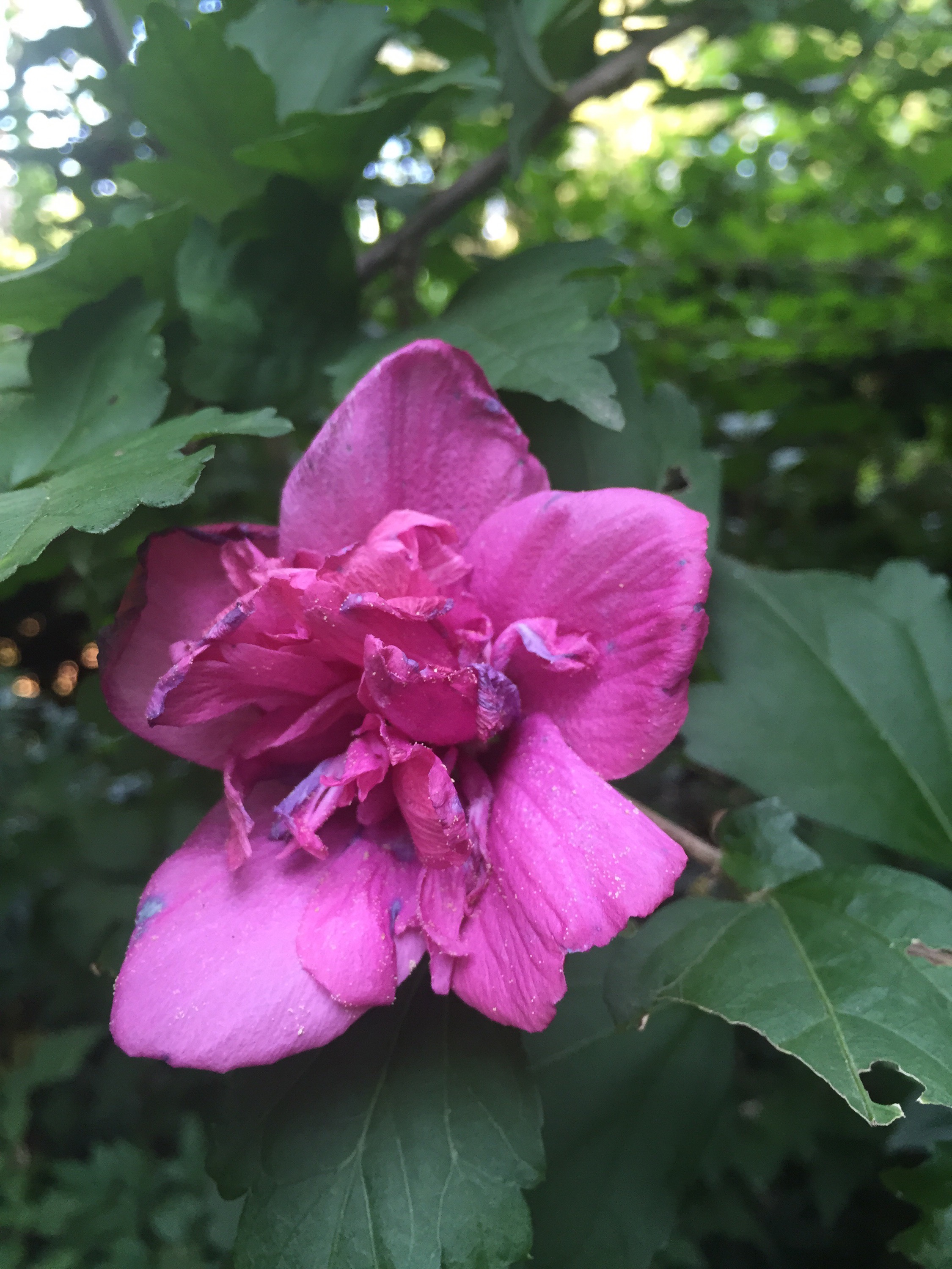 Rose-of-Sharons are wonderful large shrubs or small tree in the hibiscus family which bloom late summer until frost. The flowers are shades of white, purple, or burgundy and with or with-out a red throat. The single flowered varieties reseed to the point of becoming weedy! The flowers are only about three inches wide but if you don’t trim the plants they grow in a vase-shape to about 10 or 15 feet here in the Piedmont region on North Carolina.