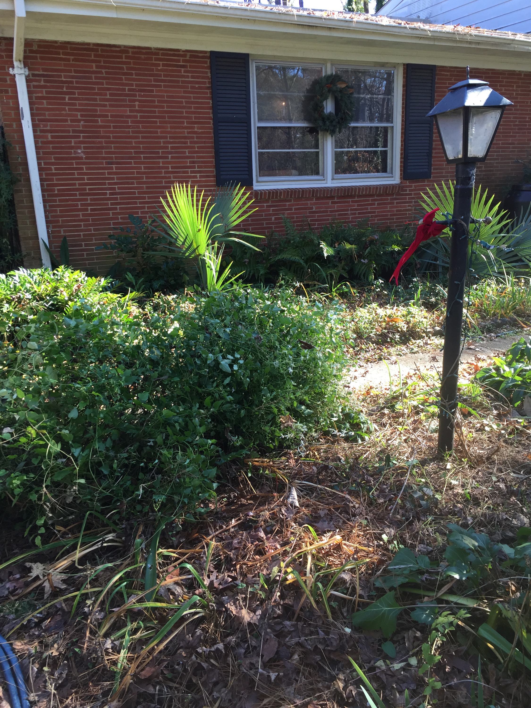 The heavy vines are huge now and are a tangled mess. Below is one of the lights with the removed growth from just one season to the left! The light is five feet tall.