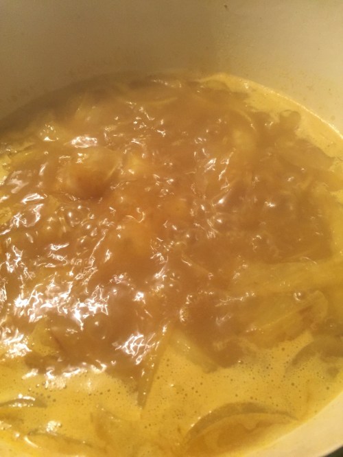 Add about a cup of vegetable both to deglaze the pot. Use your wooden spoon to scrap the carmelized bits of onion off the bottom.