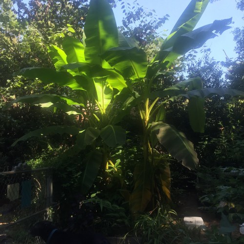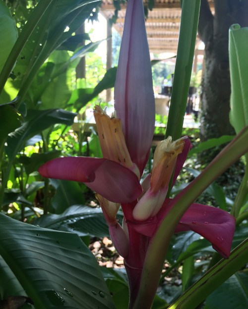 A blooming and fruiting pink banana at JC Raulston Arboretum at NCSU.