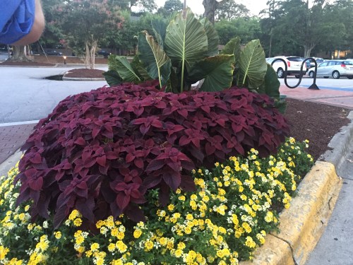 So I have been enjoying the gardens and plantings around Raleigh. The above planting in Cameron Village Shopping Center of alocasia, coleus, and lantana.