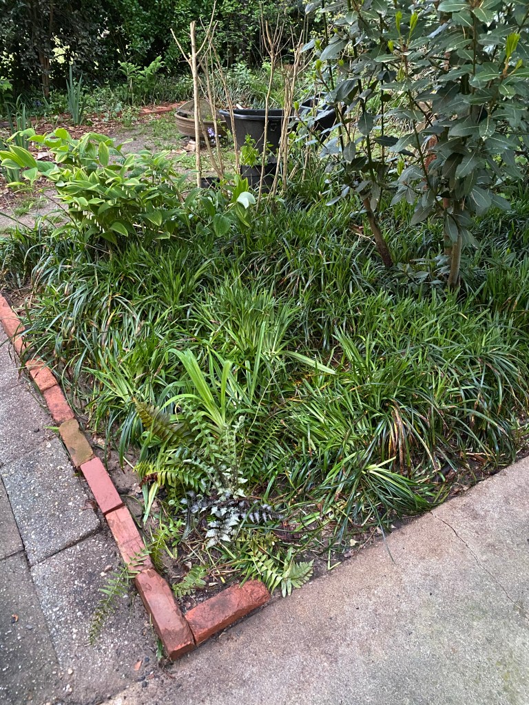 A beautiful day here in Raleigh to edge the patio and dig back the Liriope and reset the brick boarder. A nice little clump of Solomon Seal to the left and Bay laurel to the right. A Japanese Painted Fern and Christmas in the fore corner. Both were self seeded/spores which is why they are so close to each other.