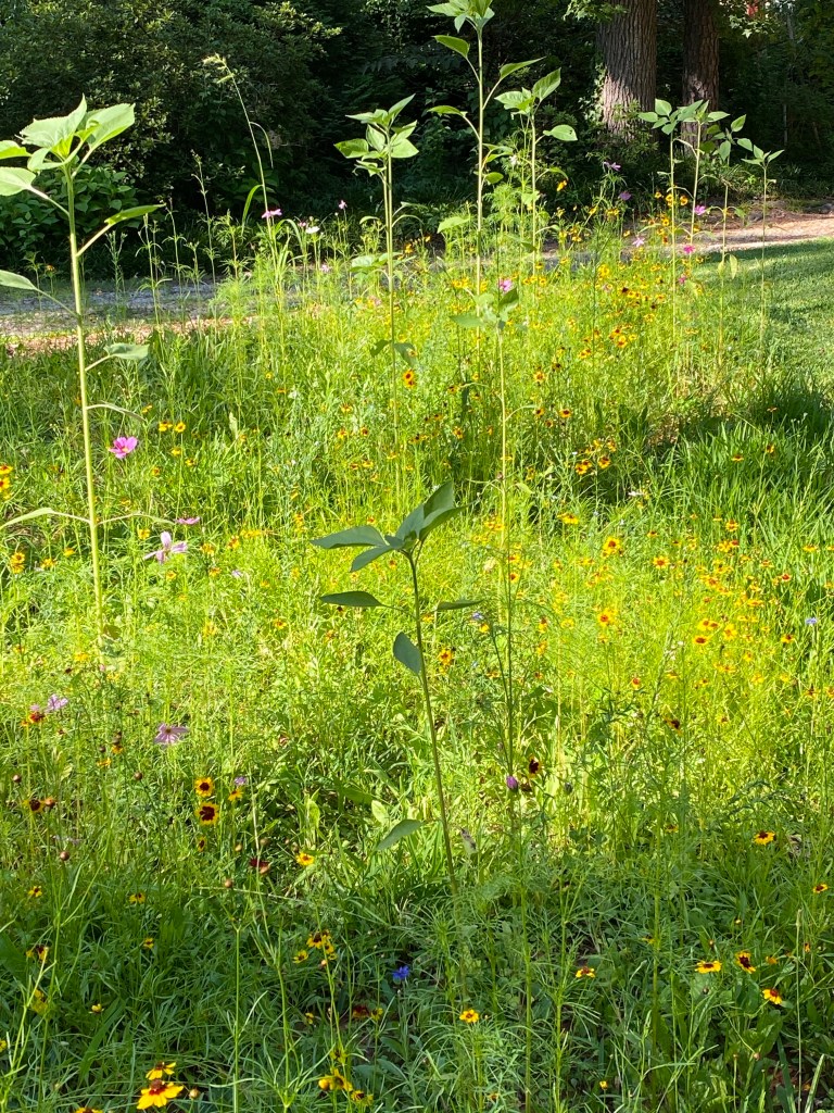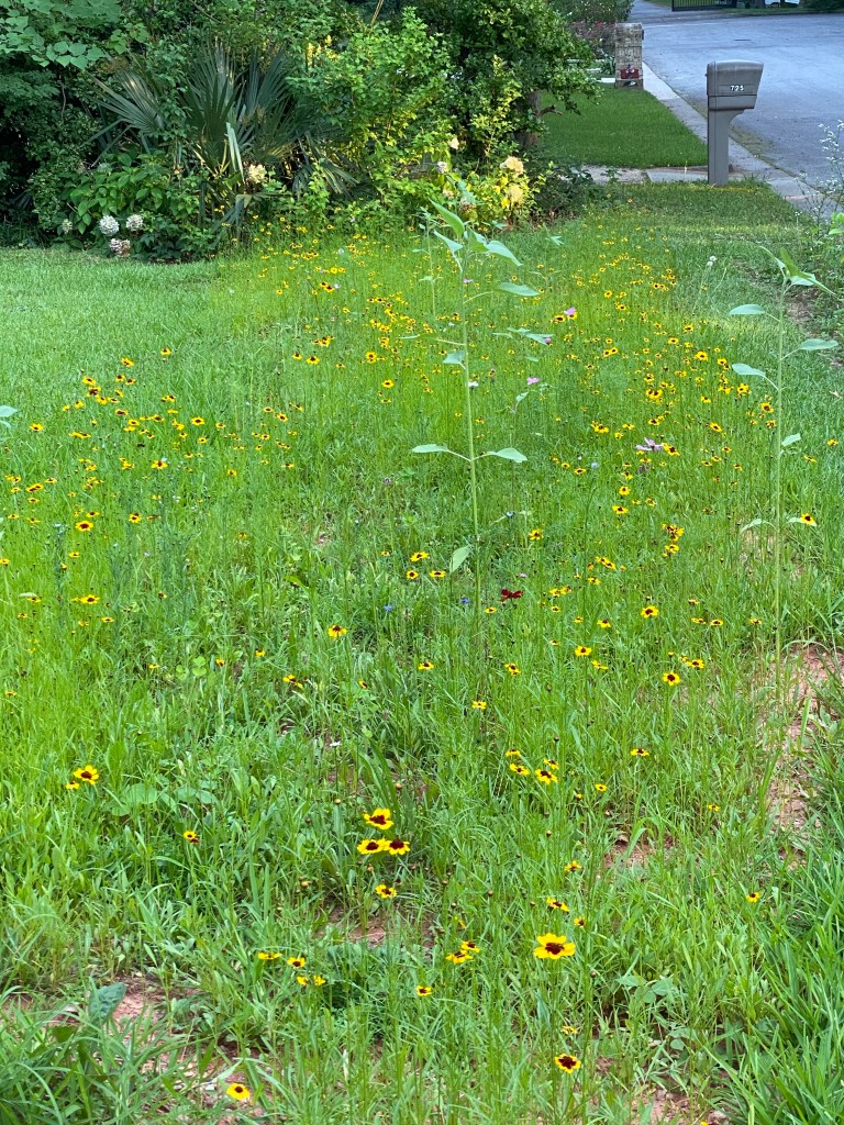 The Meadow along the road today…..background: there was a low area along the shoulder of the road where a drainage ditch was before the neighborhood was taken into the city limits in the late 80s. When the city placed the curb and gutter they did not make the new shoulder even with the old yard. It was a sharp dip off the new shoulder of the road then a rise up to the lawn. I knew the tree trimmers were going to make some big ruts in the yard when they removed the five trees in April so I ordered a load of soil to fill in the ruts from the tree trimming trucks and to level the yard with the road shoulder. I sowed several pounds of meadow wildflower seeds on the new soil to stabilize it until the lawn grass ( St Augustine and Centipede) grew back across the area.