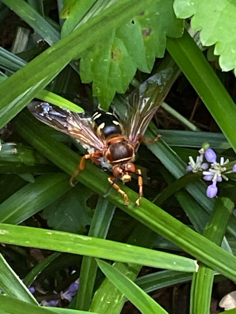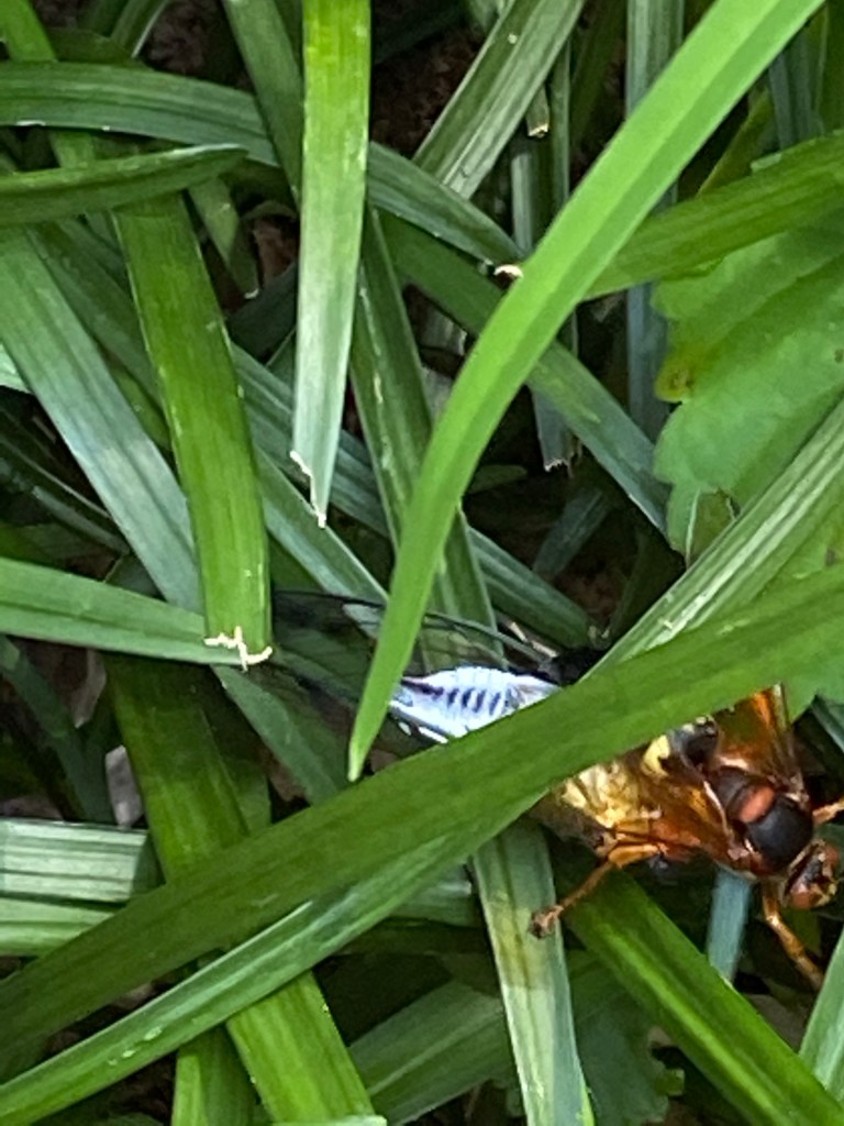 Sphecius speciosus, often simply referred to as the cicada killer or the cicada hawk, with a victim.