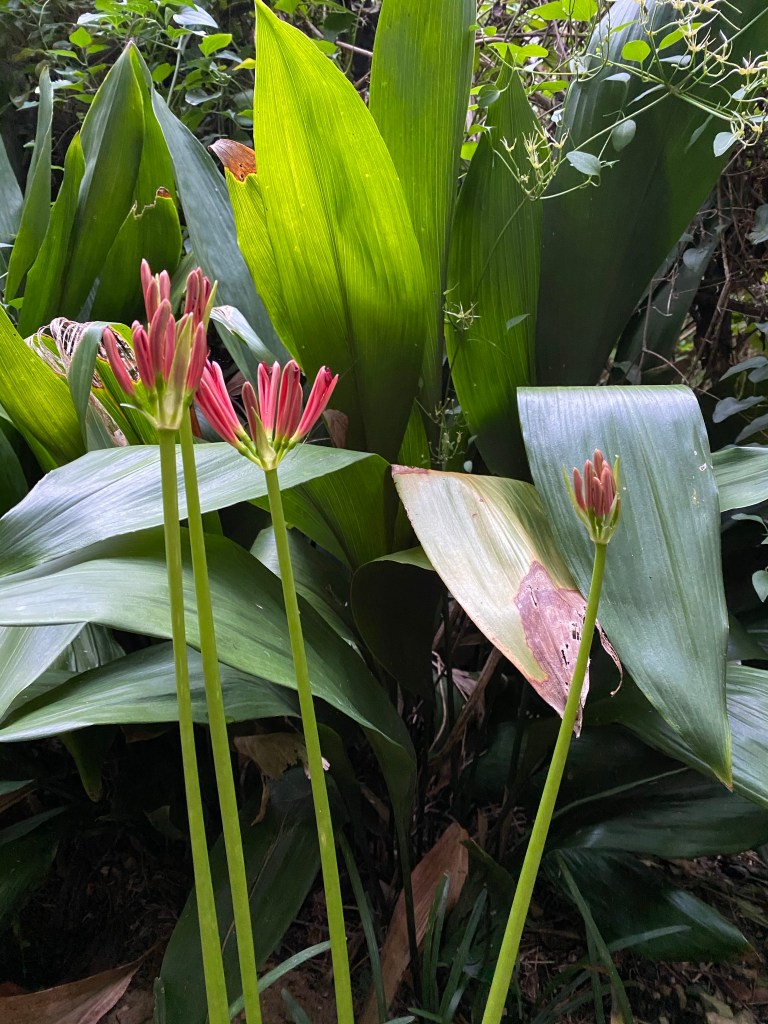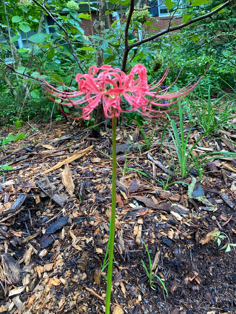 Hurricane lily (Lycoris radiata var. radiata) also known as red spider lily. The plant produces airy clusters of red flowers in the Fall with whisker-like stamens on top of naked stems that will grow up to 18 inches tall