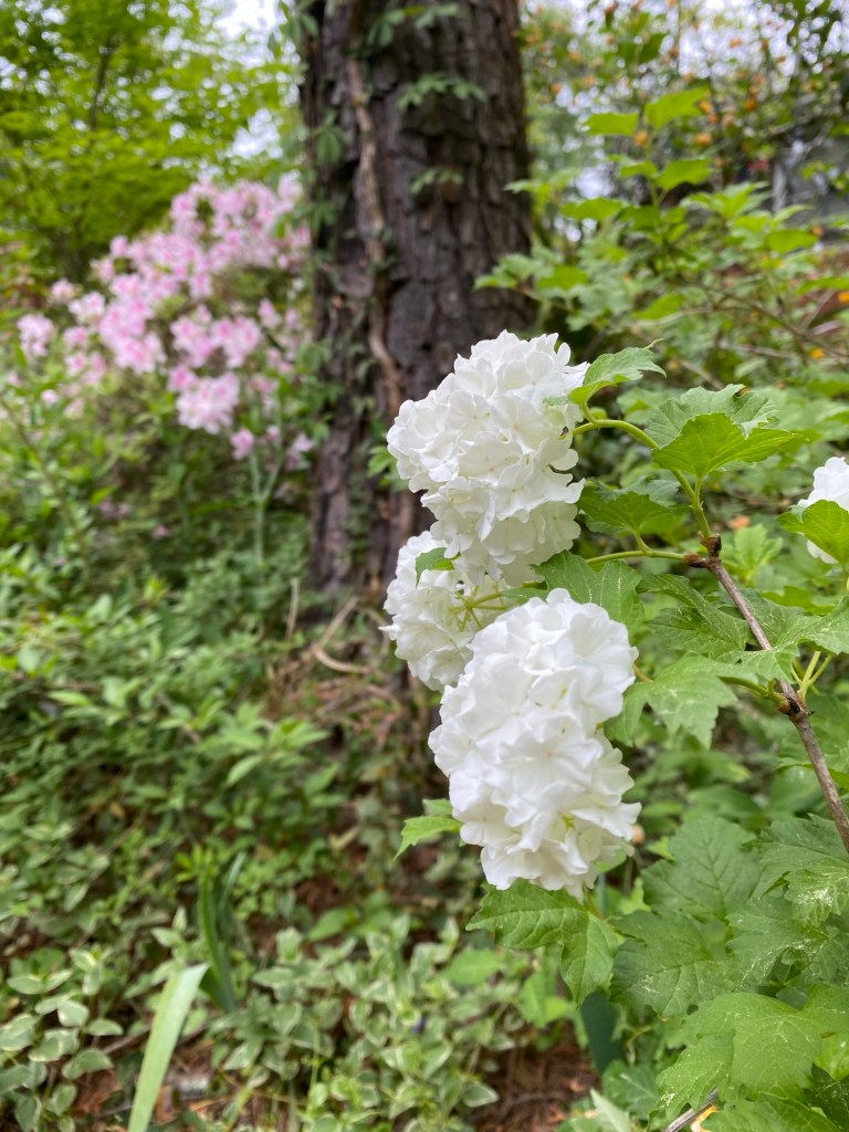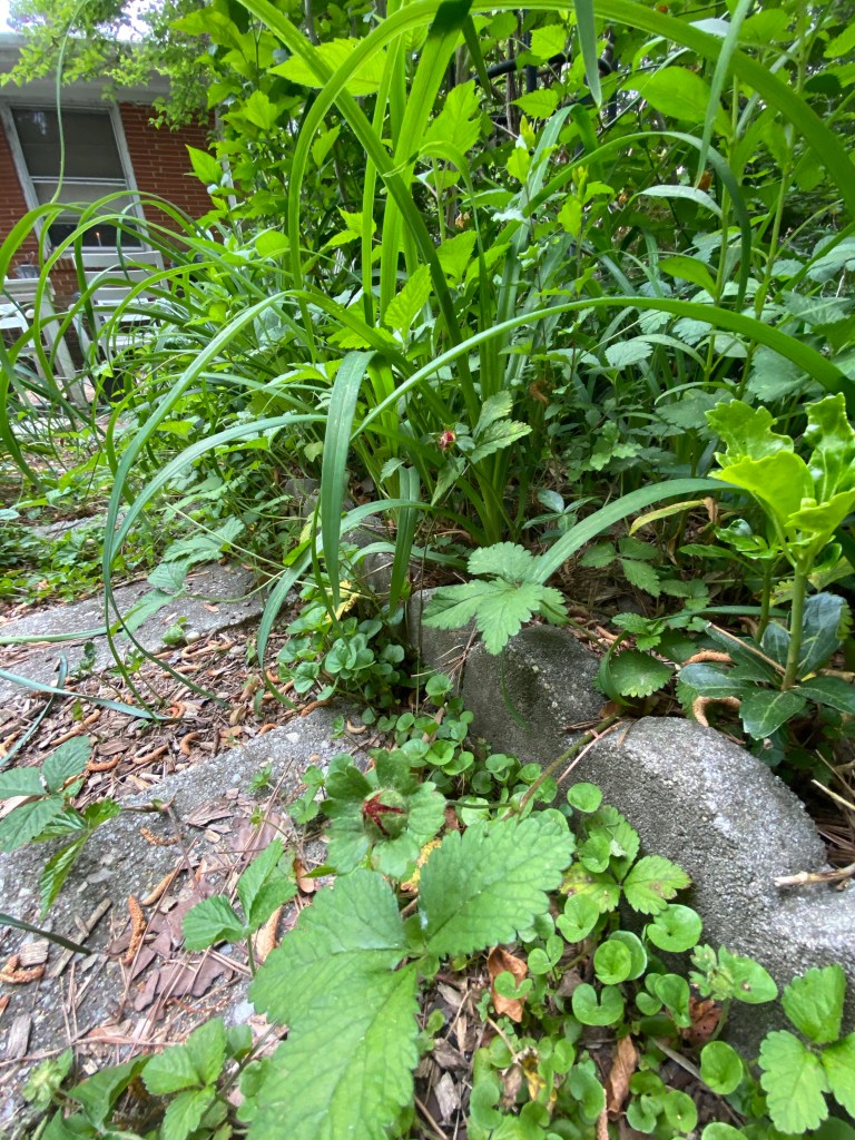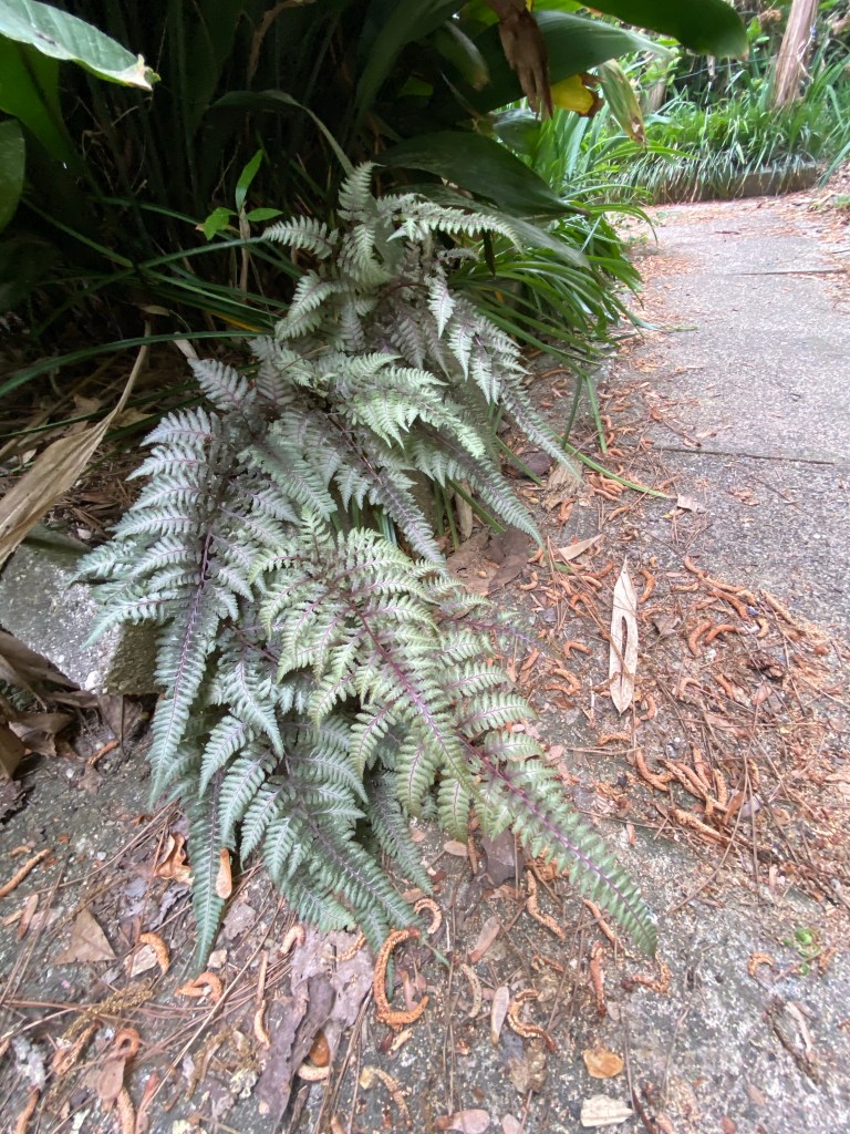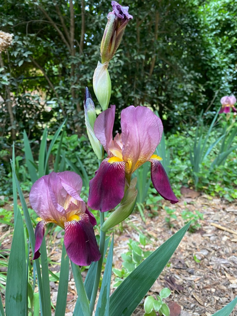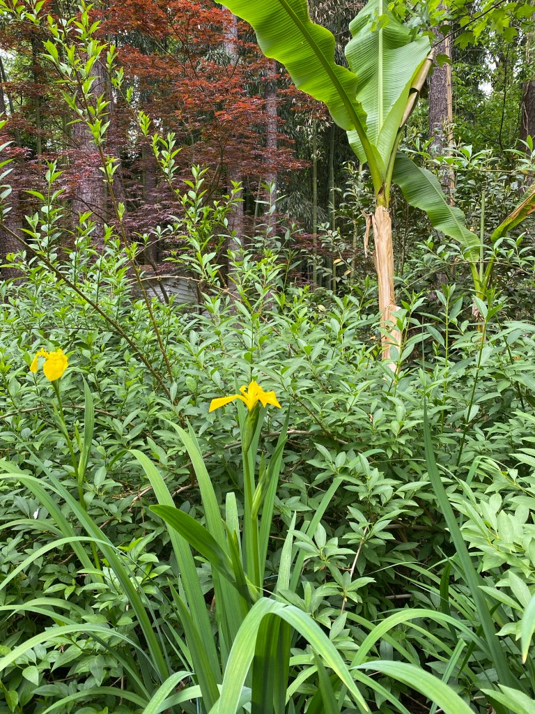 German iris with an Orange Storm quince finishing its bloomBarren strawberry Empress Tree: generally considered an invasive tree but if you cut them back to stumps each season they do not bloom and produce thousands of seedlings and they reward your efforts by shooting straight up to about ten feet with huge umbrella sized leaves.Snowball Bush with George Tabor indica azalea in the background.Red buckeye German iris Japanese painted fern Yellow flag water iris : yes, there is a small plastic pond under all that forsythia.Boston Ivy, Autumn fern, and passionflower Tropical day flower (Tinantia pringlei ‘Panther’) Panther Mexican Dayflower