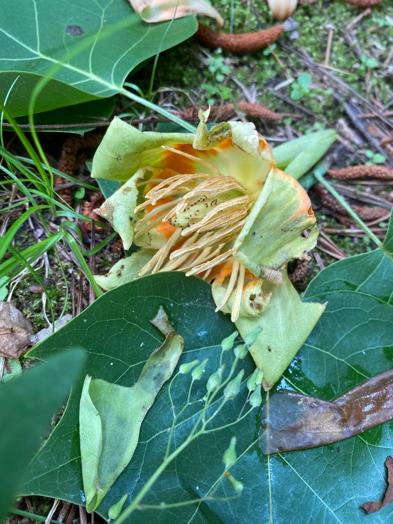 The tulip tree is one of the largest of the native trees of the eastern United States, known in an extraordinary case to reach the height of 191 feet. This is one of the reasons the flowers are usually only seen when they fall to the ground.