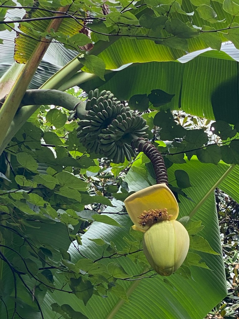 Basjoo banana with bees on its flowers and autumn clematis blooming
