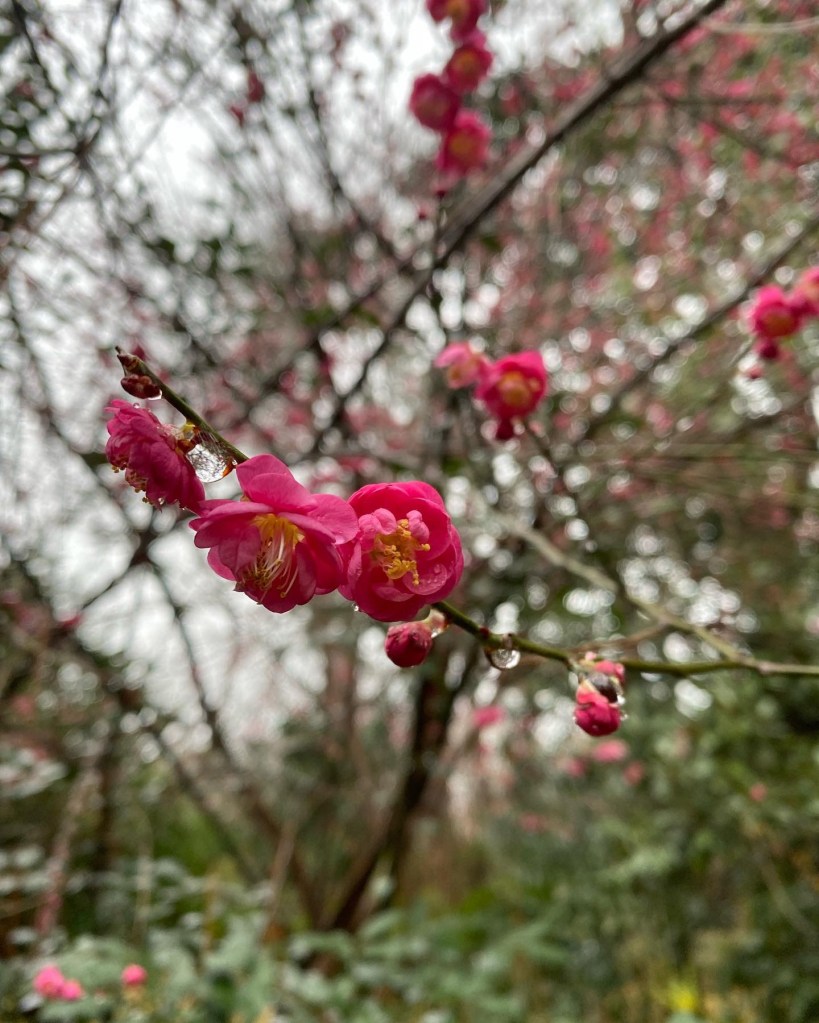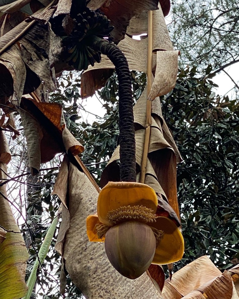 Blooming in the winter garden today… Wintersweet , winter honeysuckle, Prunus mume, Basjoo bananas, mahonia, and Rudbeckia.