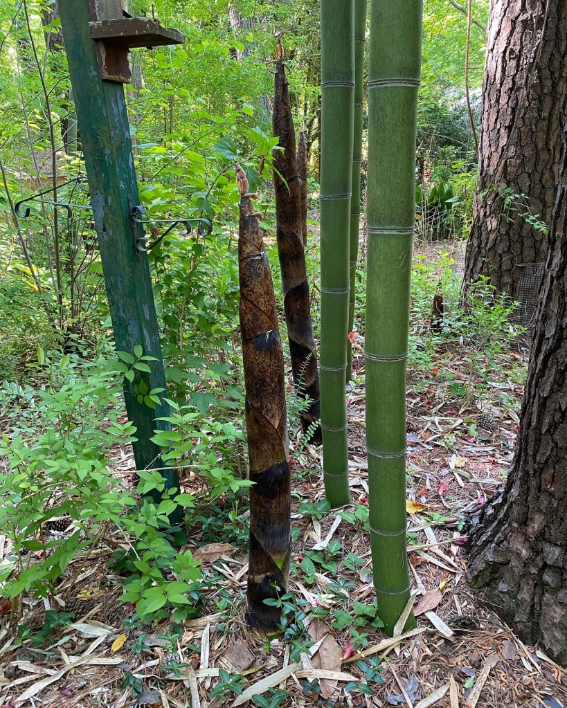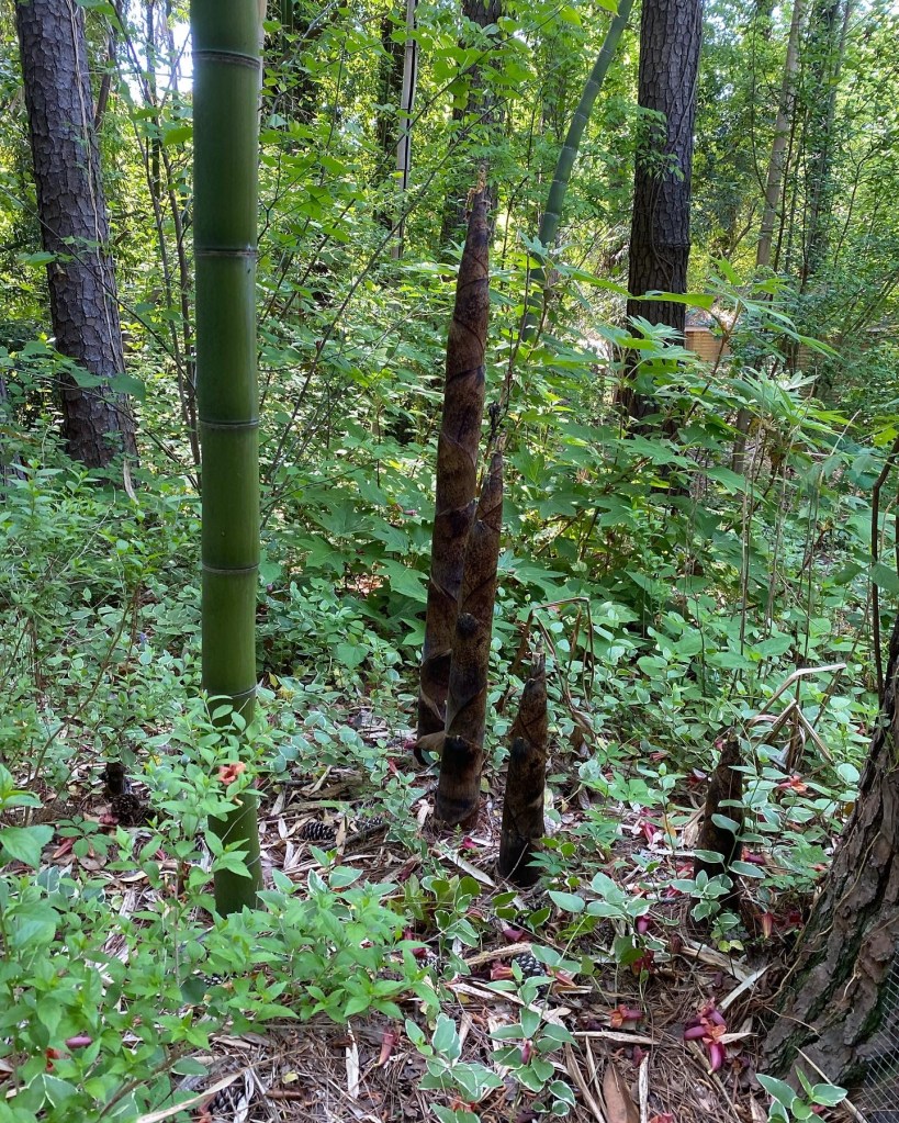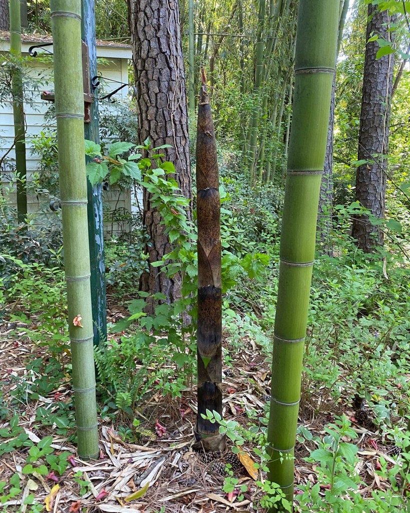 Phyllostachys vivax is one of the hardiest timber bamboo. It will mature to 45 feet in height, with 3-4 inch diameter canes, but if given ideal conditions in SE USA, or China and Japan, it can grow to 70 feet and 5 inches in diameter. It is usually the quickest to attain large size in the PNW. Even though they have a large diameter, the culms have a thinner wall than average thus are not especially strong. They are very attractive and can be used for many craft or decorative projects, but not recommended for building grade material. Shoots from this bamboo are among the best eating, and are prolific in the late spring. Often the new shoots emerge in mid to late May, depending on the weather pattern which influences the soil temperature. middle left. This bamboo is over 30 feet tall and is growing on a raised berm that is less than 30 feet in circumference. A miniature grove has formed a very effective vertical screen.
