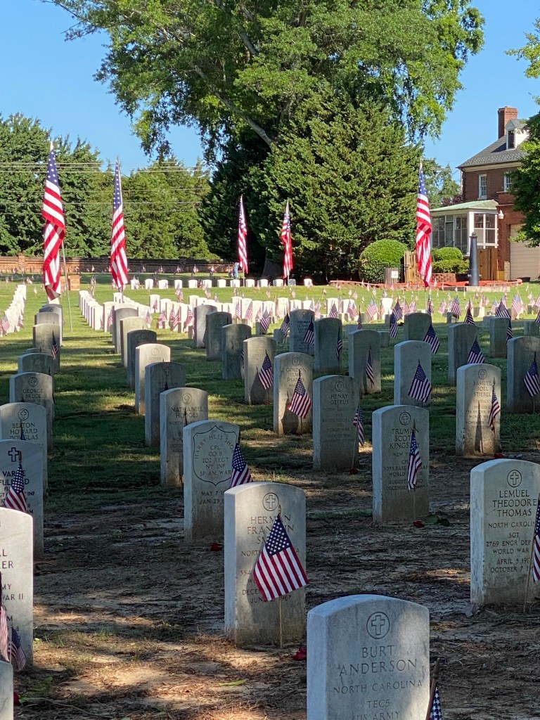 A very large Gardenia Volunteers placing flags and roses at the graves of soldiers in the Raleigh National Cemetery which has graves from the US Civil War through today. It encompasses 7 acres (2.8 ha), and has 6,000 interments.