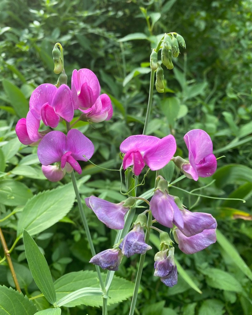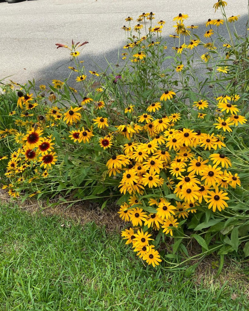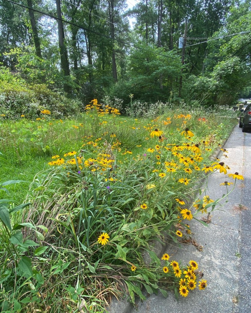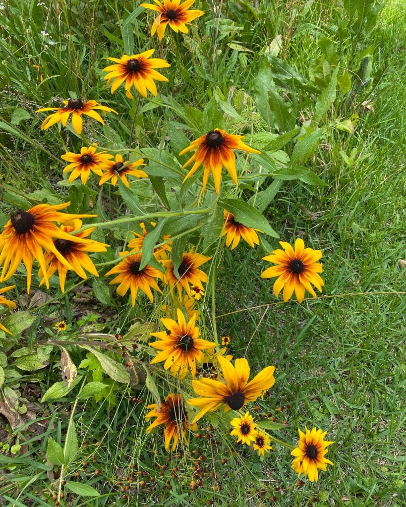 I seed this fresh dirt with about a pound of different wildflowers. The lawn grass has just about covered the new soil but the wildflower meadow is blooming well in its second season.