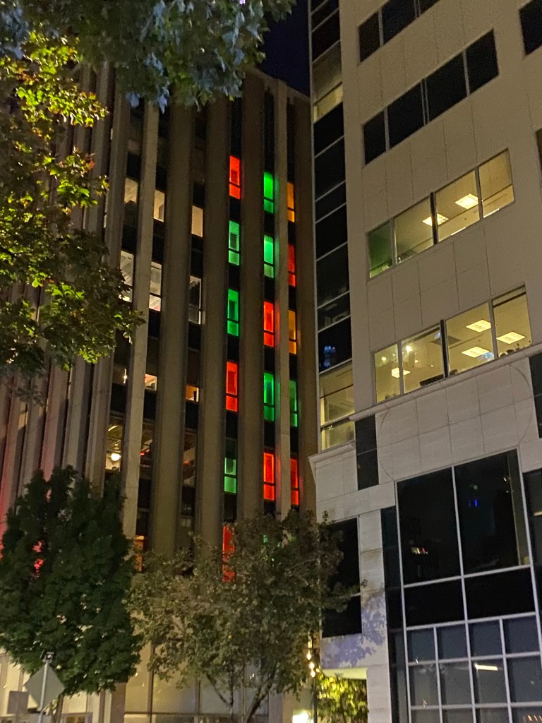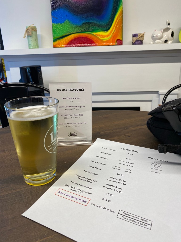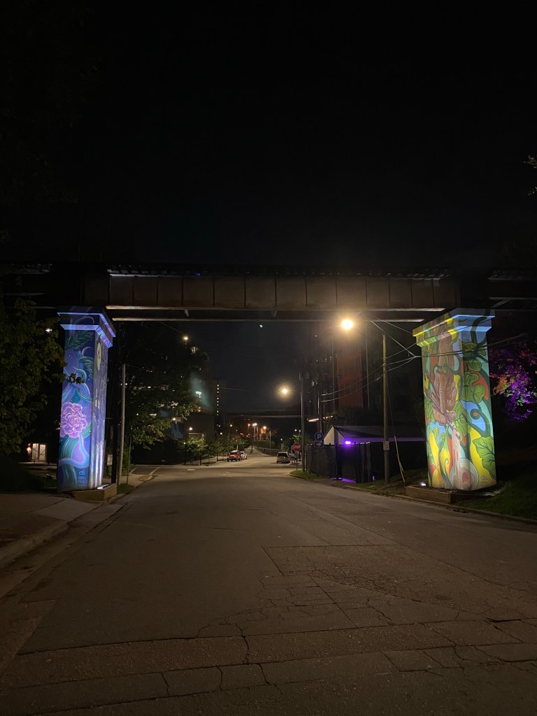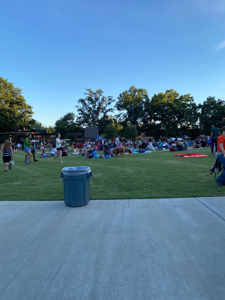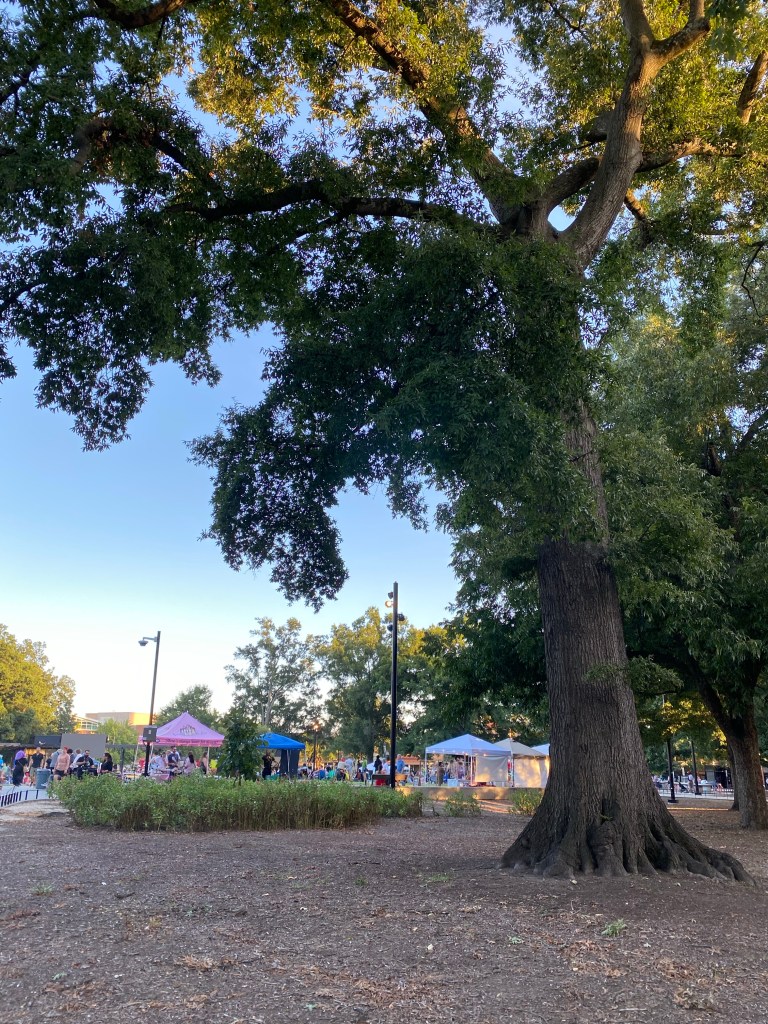 Moore Square is one of the planed five squares of parks created by the Dutch city planner, William Christmas, in the 1790s after the revolutionary war with Great Britain for independence when colony leaders were creating a new centralized state capital. The original plan can be seen in the names of the streets. It is original layout is bound by North Street, West Street, South Street, and East Street. Tonight’s movie was Back To the Future.I do not know why this old bank building is lit in green and red on the 2nd day of September?With the small batch brewery popularity there are many small bars/ bottle shops in Downtown Raleigh. This one is called The Green Monkey, featuring local gifts, foods, and small brewer beers and ciders. They also host a run club, trivia night, bingo, and other events for people to come together. Tonight, on First Friday gallery crawl, they have a local artist featured.