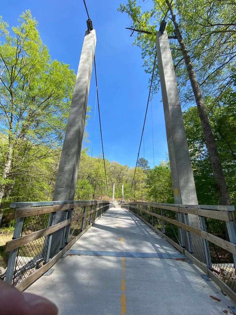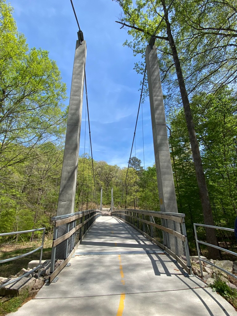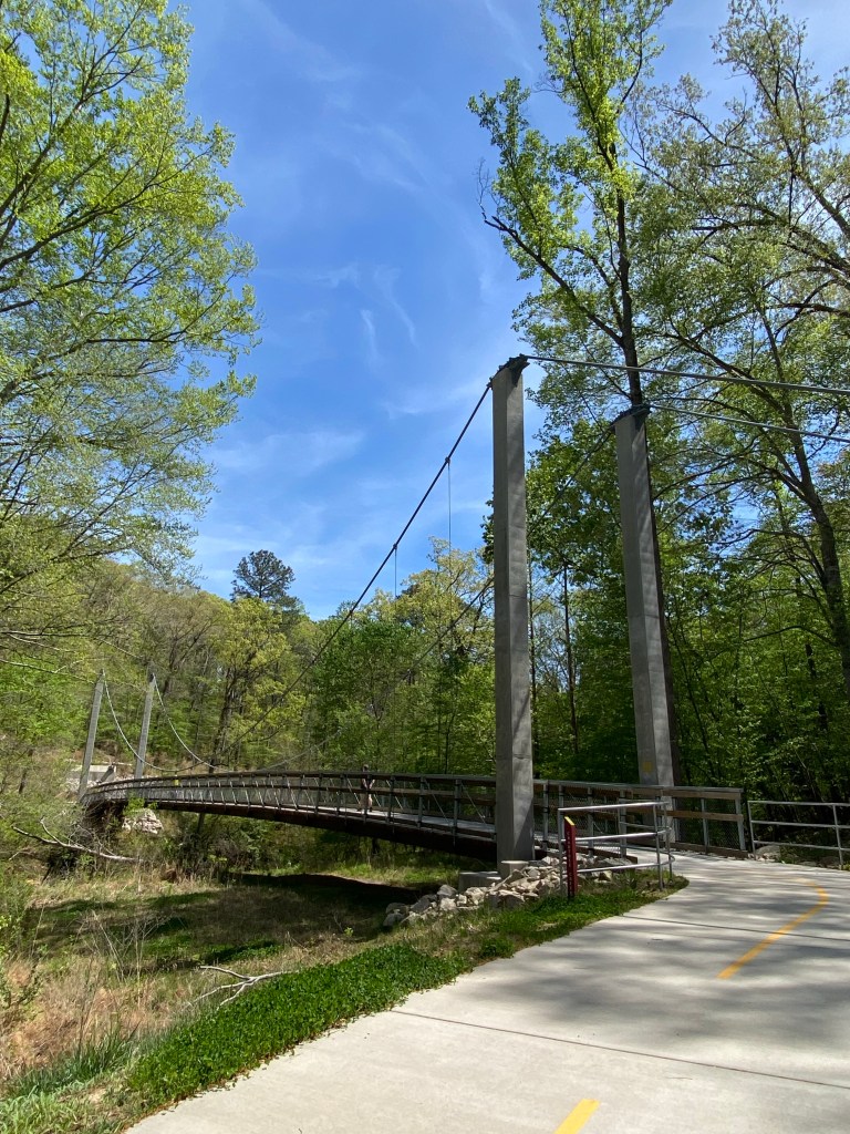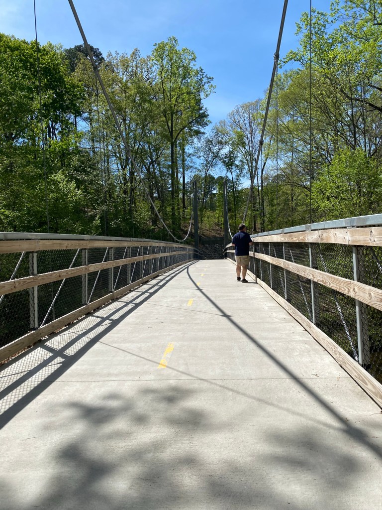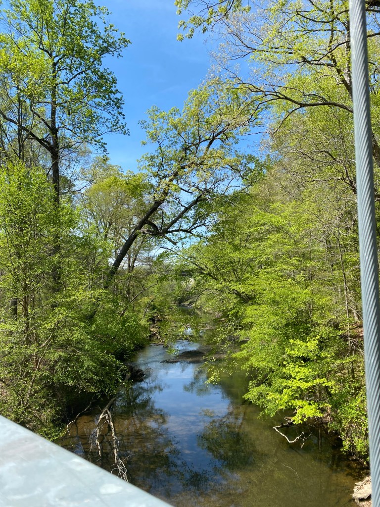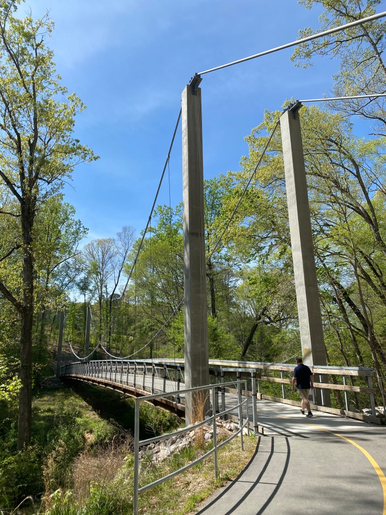 The northwest section of the Crabtree Creek Greenway runs along a section locally called Azalea Falls because there are a few granite outcrops which create a few rapids and falls. A new apartment complex was built on the hill above the section and the city required them to build a small parking lot and stairs down to the greenway . One of the features of the greenway is the suspension bridge crossing the creek.