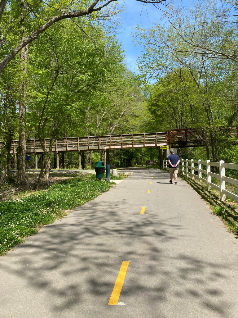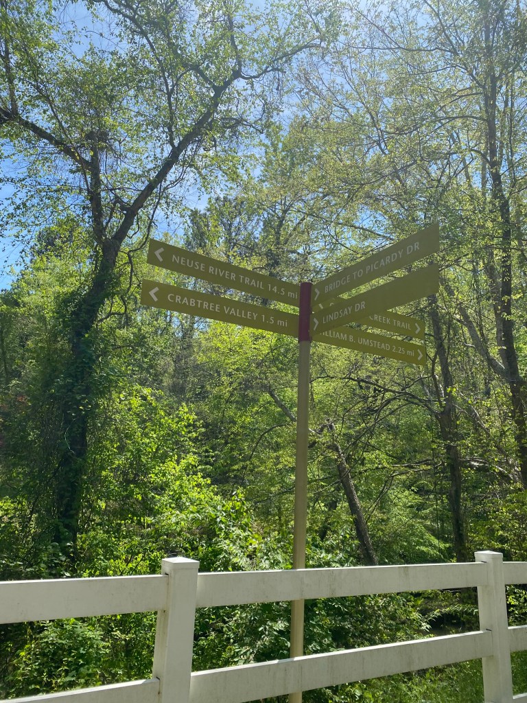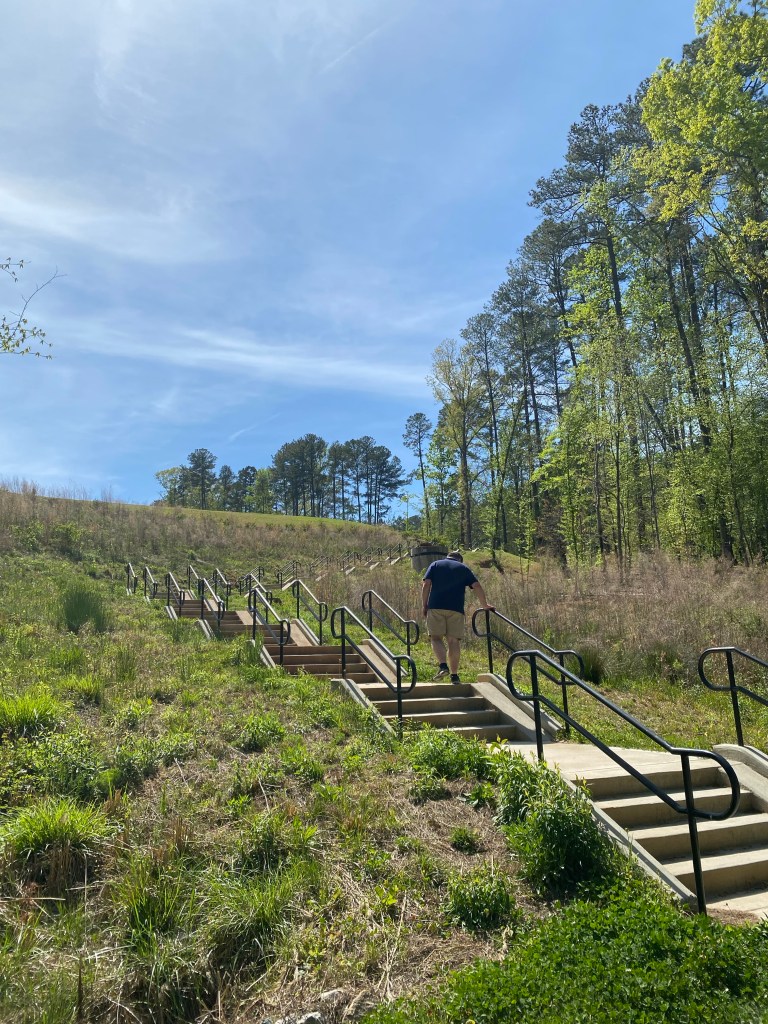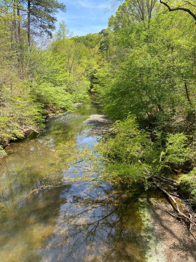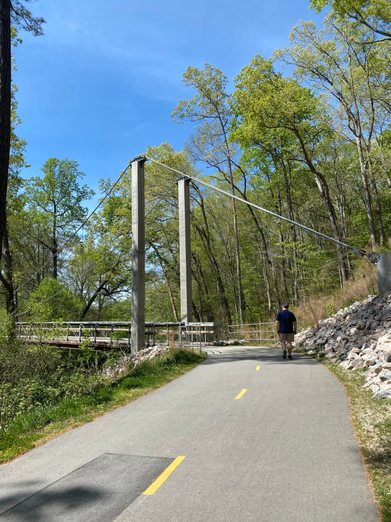 The northwest section of the Crabtree Creek Greenway runs along a section locally called Azalea Falls because there are a few granite outcrops which create a few rapids and falls. A new apartment complex was built on the hill above the section and the city required them to build a small parking lot and stairs down to the greenway . One of the features of the greenway is the suspension bridge crossing the creek.