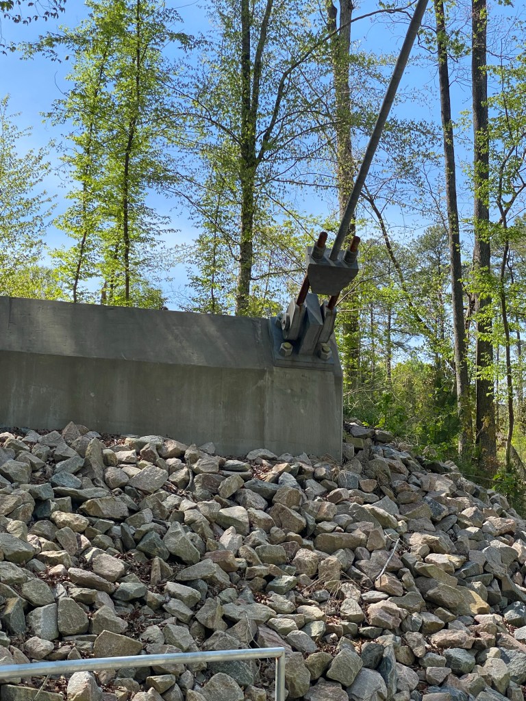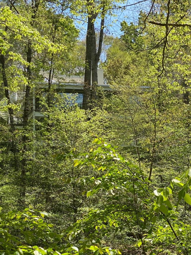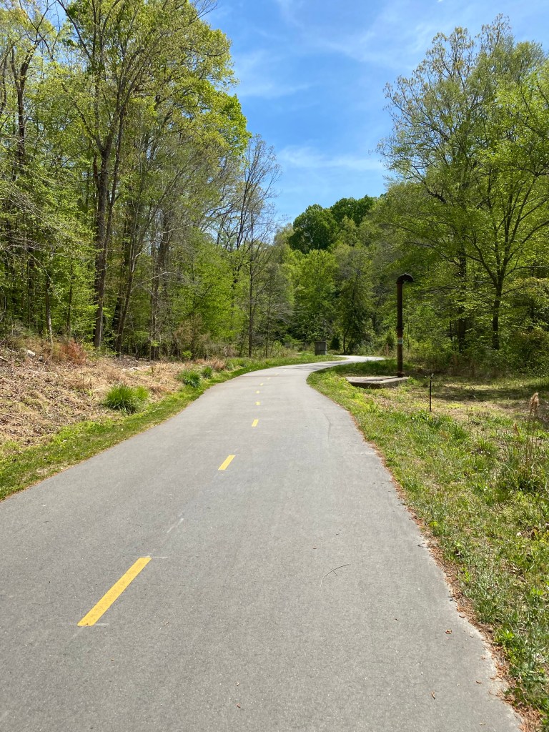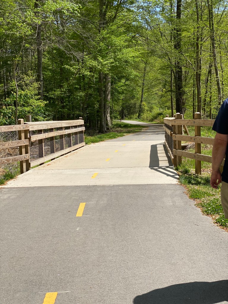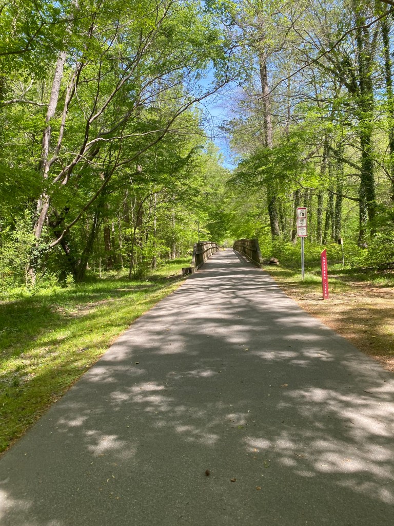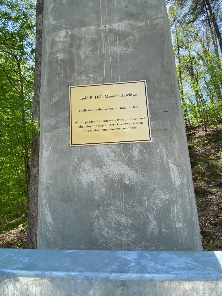 The northwest section of the Crabtree Creek Greenway runs along a section locally called Azalea Falls because there are a few granite outcrops which create a few rapids and falls. A new apartment complex was built on the hill above the section and the city required them to build a small parking lot and stairs down to the greenway . One of the features of the greenway is the suspension bridge crossing the creek.